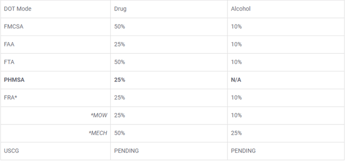 The Pipeline and Hazardous Materials Safety Administration (PHMSA) announced[1] a reduction in the minimum random drug testing rate for covered employees to 25% in 2023. To date, no other DOT modality has reported rate changes.